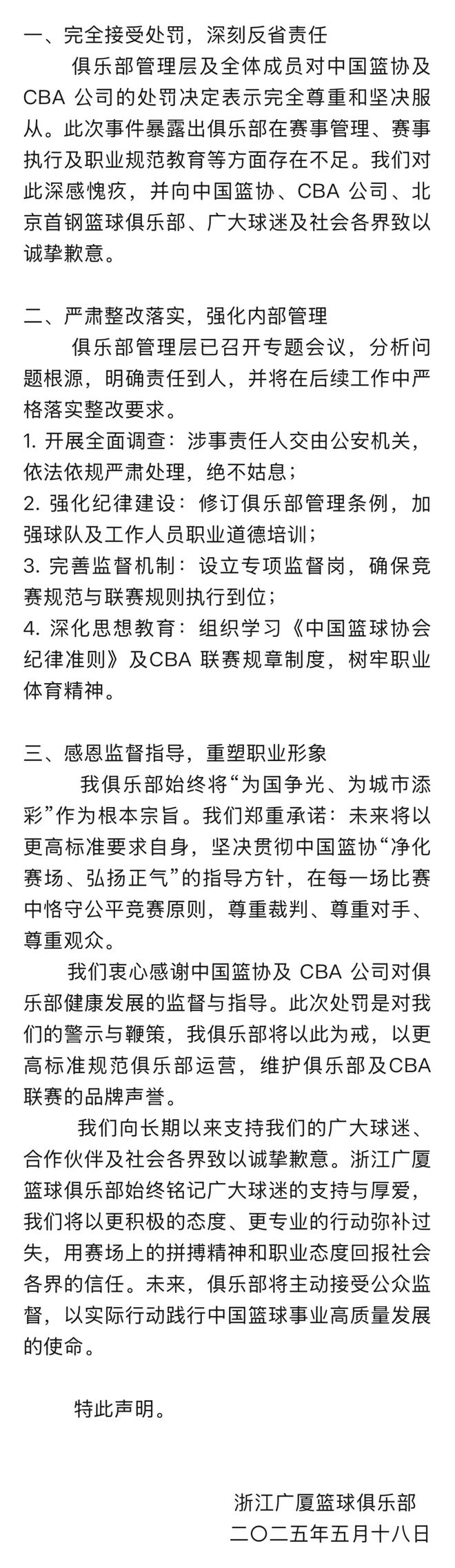 随后不久,浙江广厦篮球俱乐部发布关于诚恳接受中国篮协及CBA公司处罚的声明: